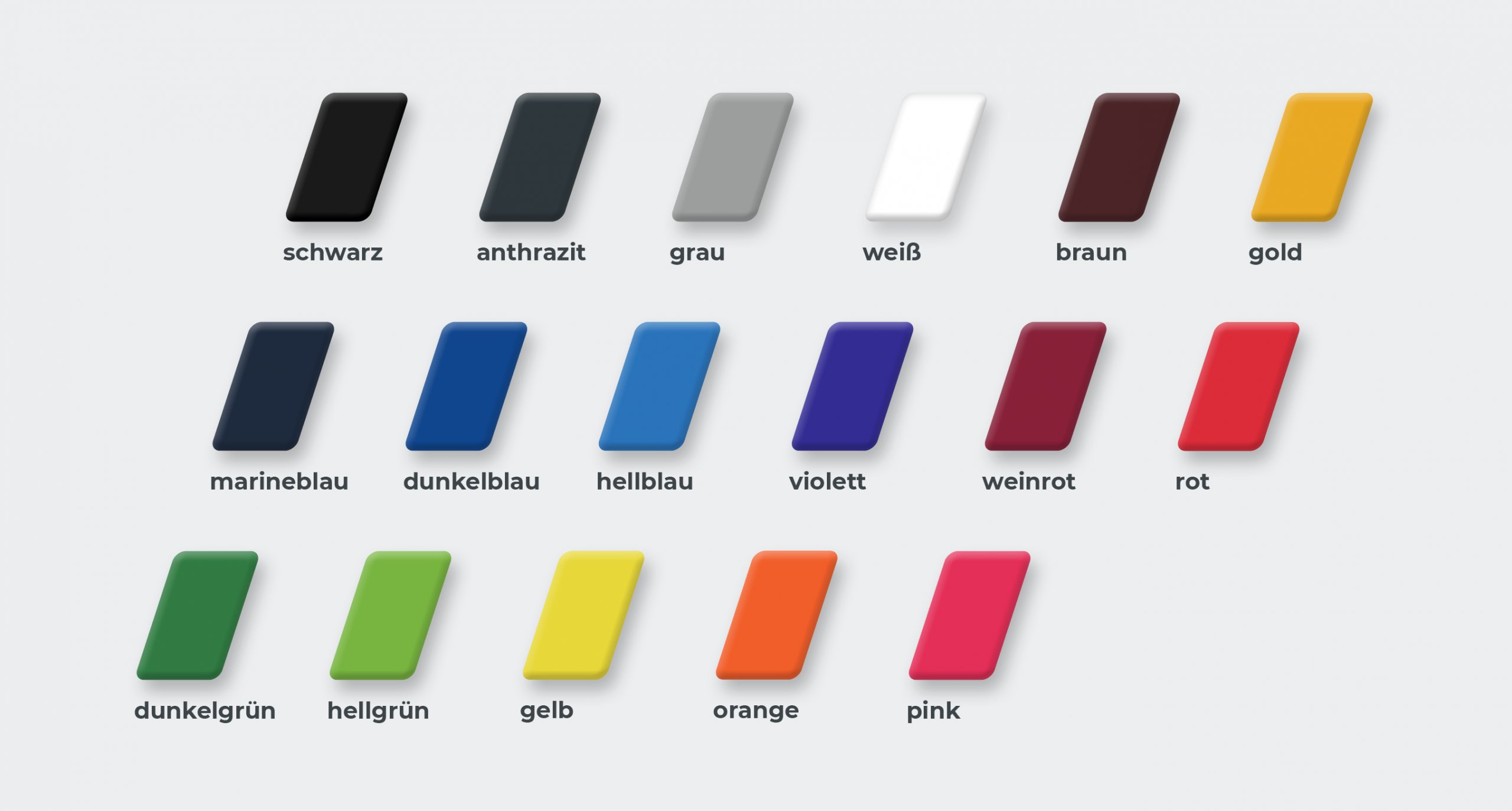 Oben finden Sie unsere Standardfarben visualisiert. Darüber hinaus können wir Ihnen jeden RAL-Farbton anmischen, den Sie sich wünschen.