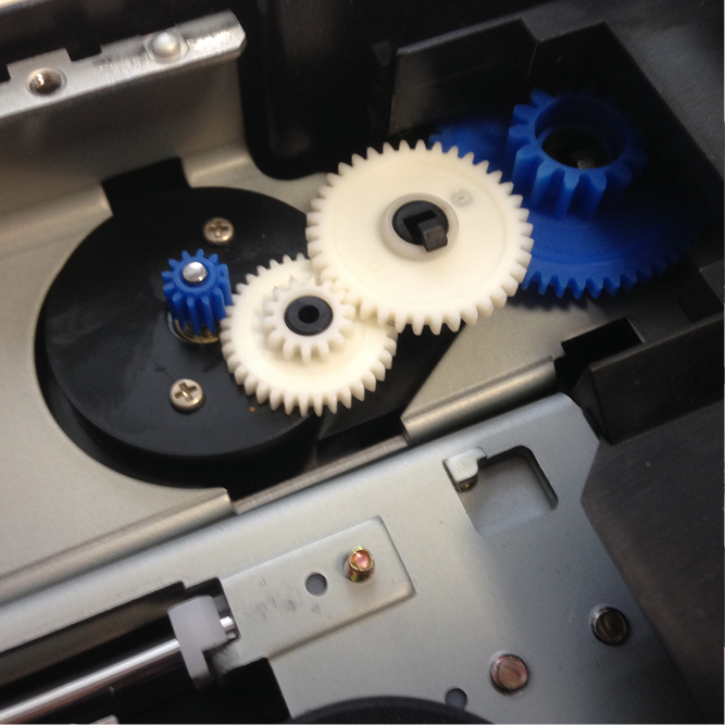 Als Ersatz für in die Jahre gekommene Bauteile wurde anhand eines Originalbauteils ein Abbild im CAD geschaffen und später mittels Polyjet-Verfahren dupliziert. Dieses Verfahren zeichnet sich durch geringste Schichtstärke und höchste Genauigkeit aus. Die Zahnräder weisen eine Höhe von weniger als 8 mm auf.