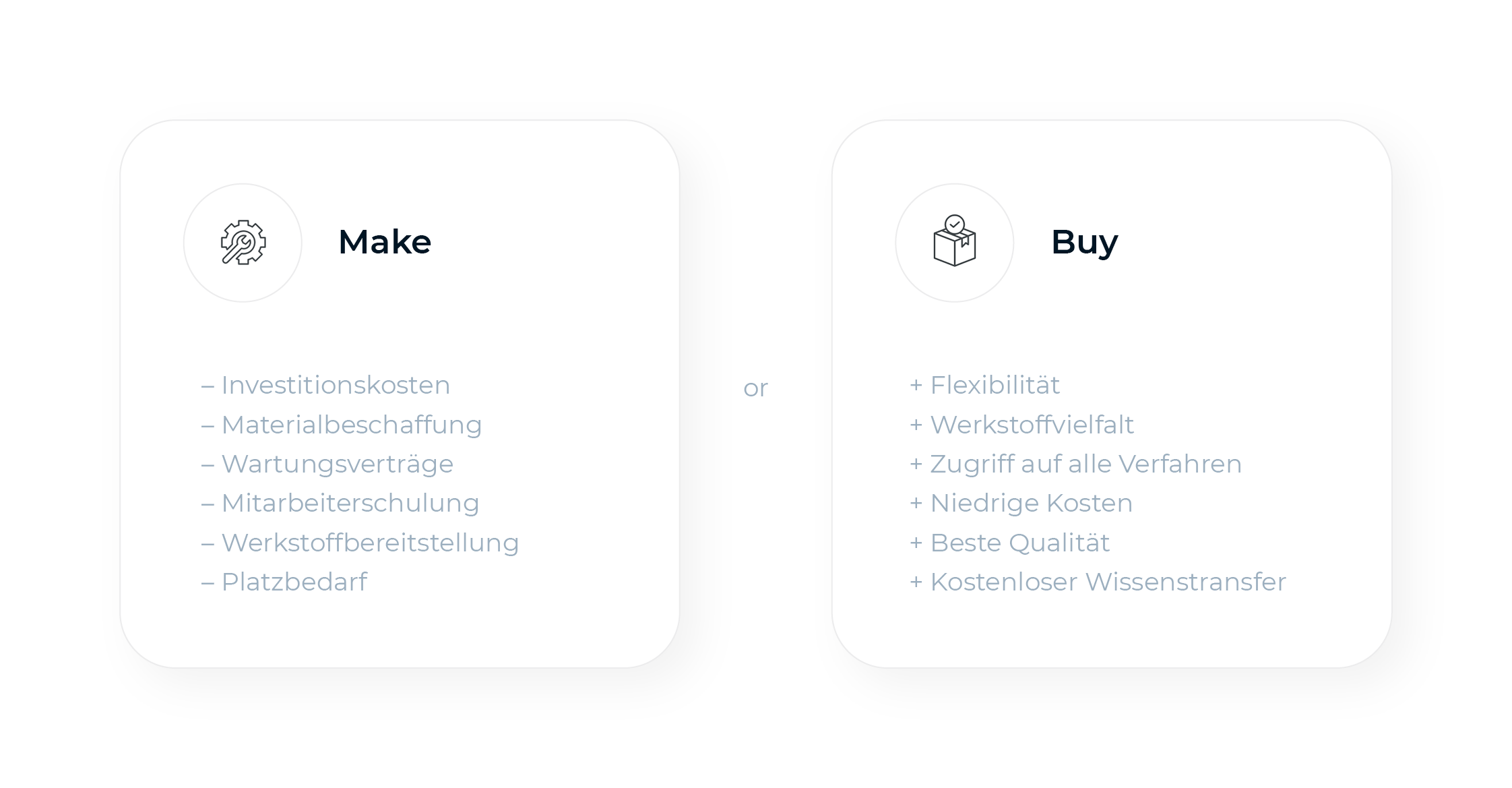 Der national als auch international wachsende Wettbewerb verlangt von den Unternehmen nach einer Reaktion auf diese sich ändernden Rahmenbedingungen. Dabei sind Weiterentwicklungen bei gleichzeitiger Kostensenkung notwendig. Die Entscheidung zwischen Eigenfertigung (Make) und Fremdbezug (Buy), sollte daher gründlich abgewogen werden. Als Dienstleister verstehen wir uns als Lösungspartner für diesen Bereich. Somit sind Sie jederzeit Teil der schnellen Entwicklung im Markt der additiven Fertigung und können alle Potenziale voll ausschöpfen.